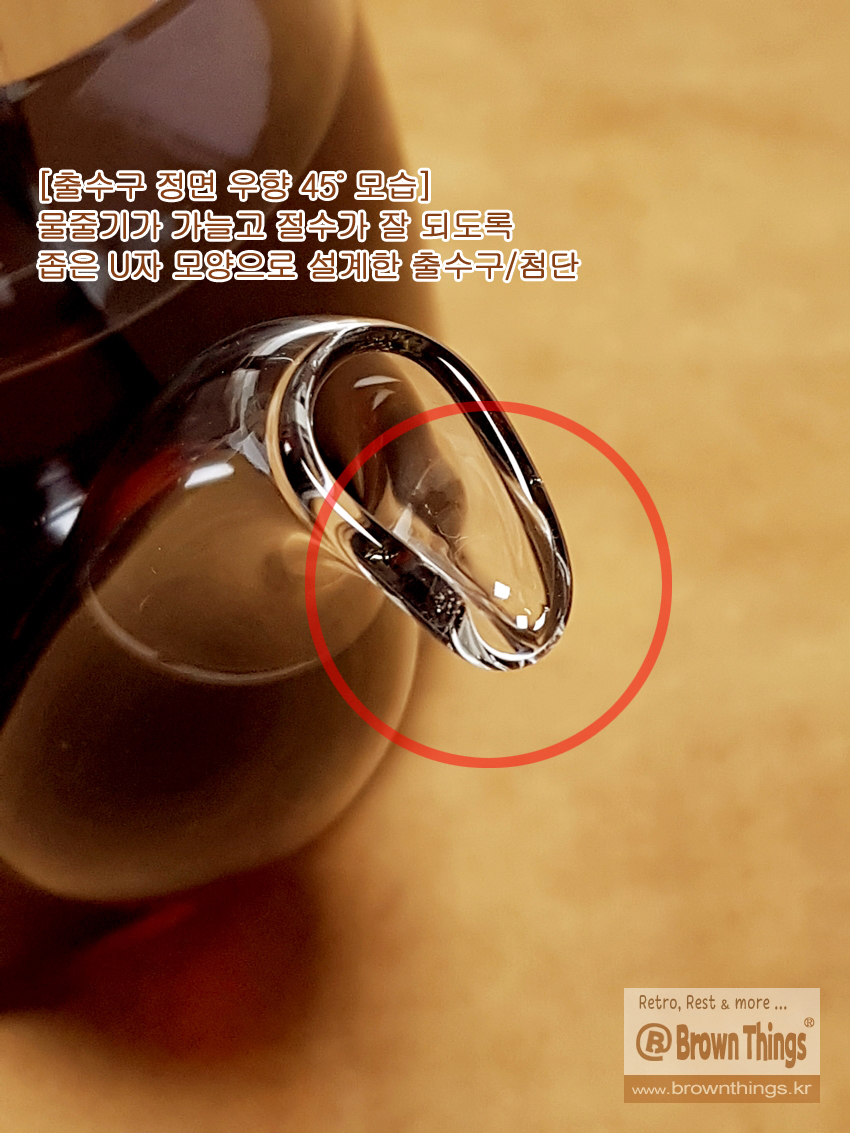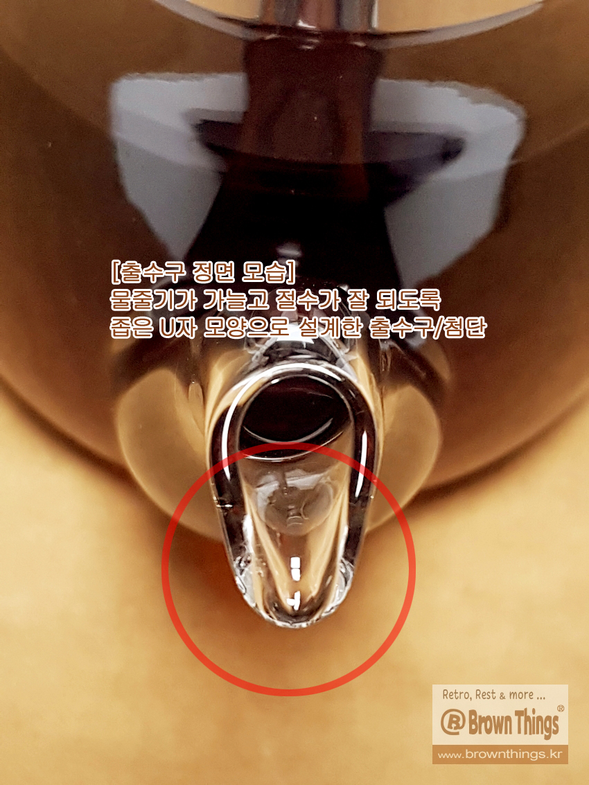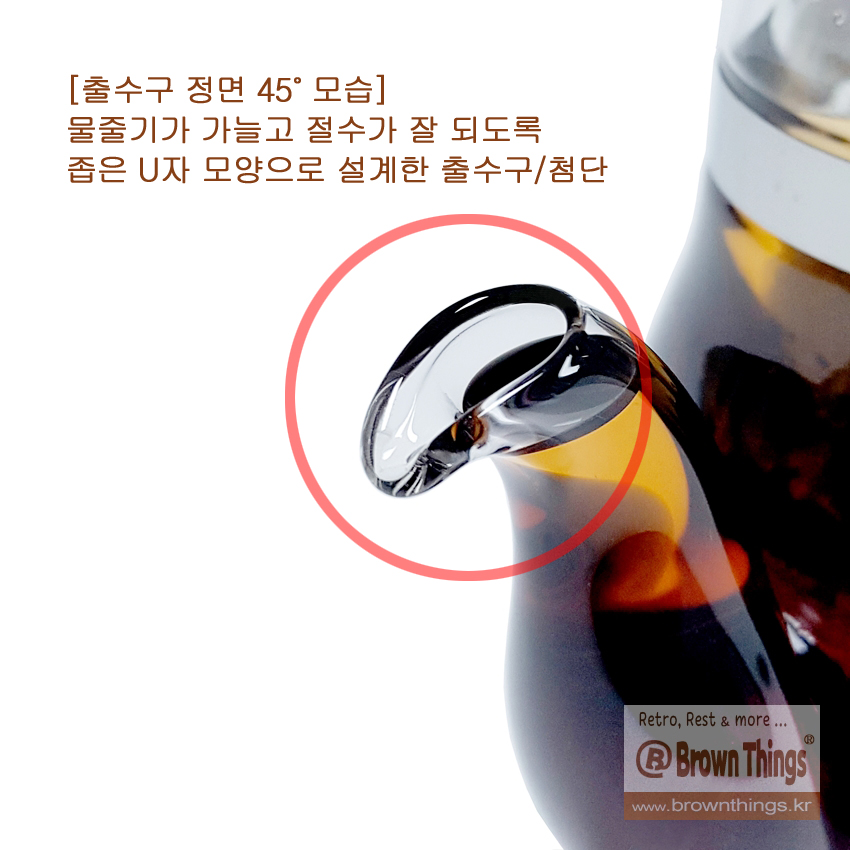 • 차를 따르는 주둥이가 자사/도자 다기의 주전자 형태이며, 출수구 끝 절수부를 U 모양으 좁게 만들어 높은 절수력이 특징