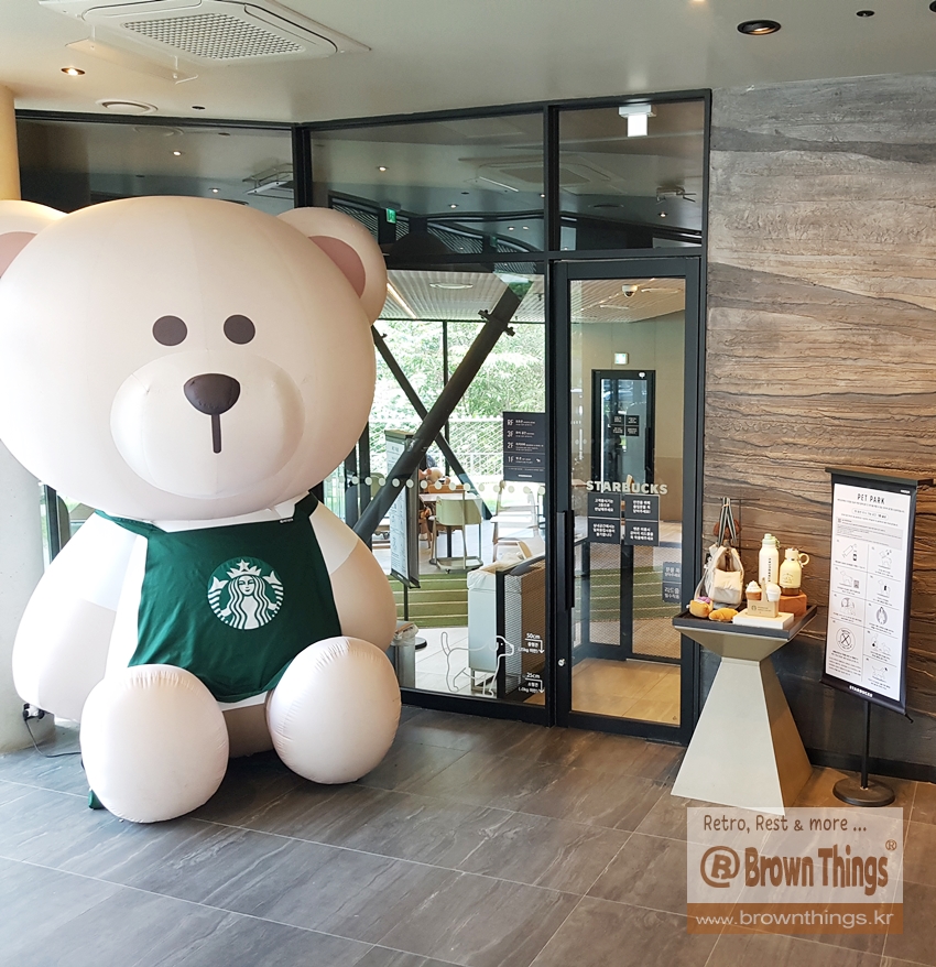 스타벅스 더북한강R 문을 열고 들어서면 왼쪽으로 보이는 펫 파크와 강아지 테마 스타벅스 MD 상품 전시대.