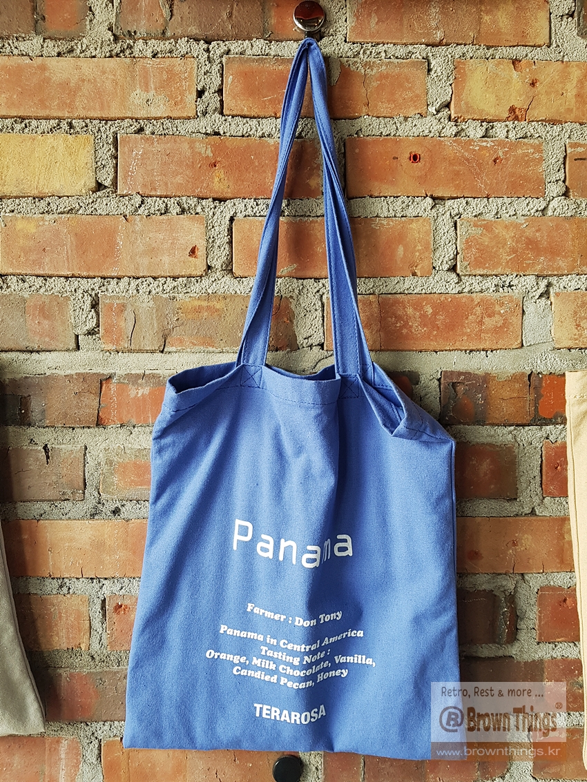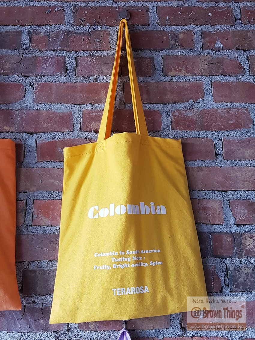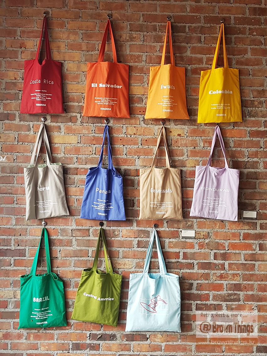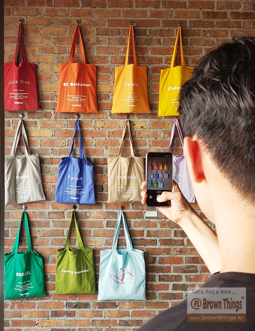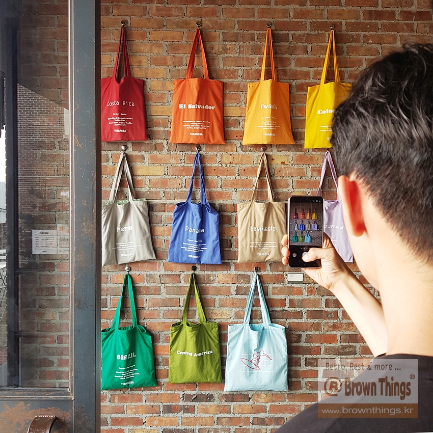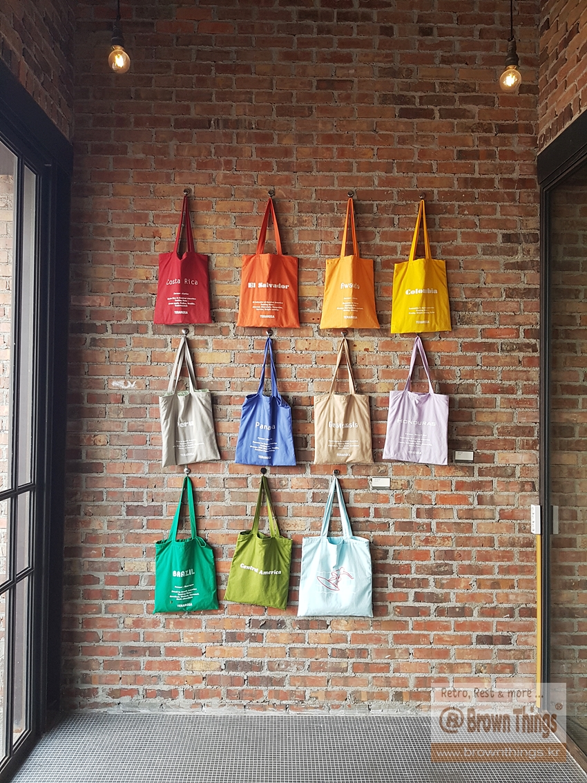 테라로사 서종점 문을 열고 들어서면 바로 왼쪽 빨강 벽돌벽에 매달려 있는 커피 산지 나라 이름을 적은 에코백들.