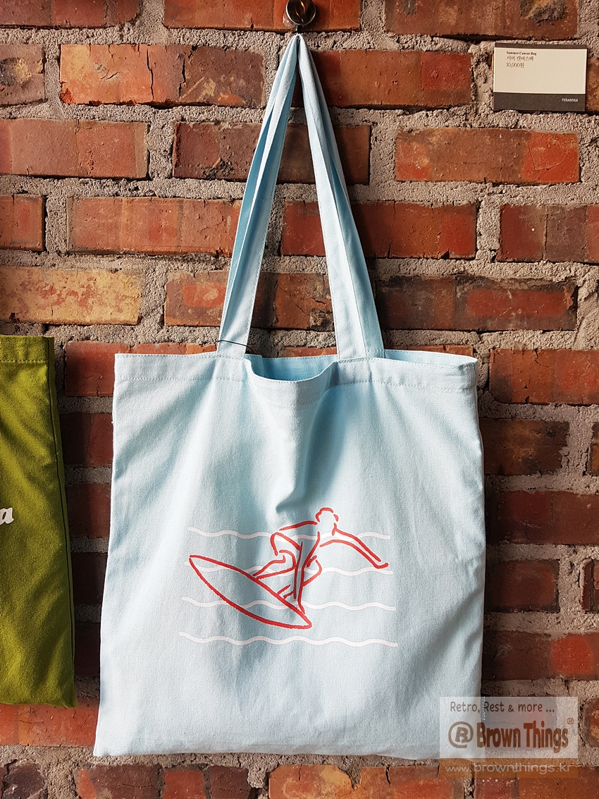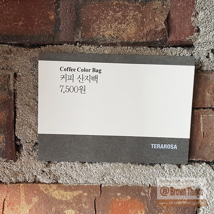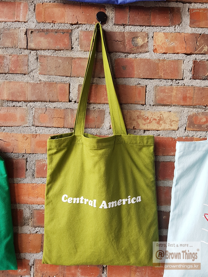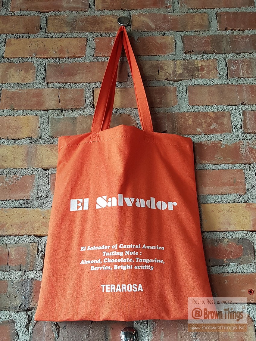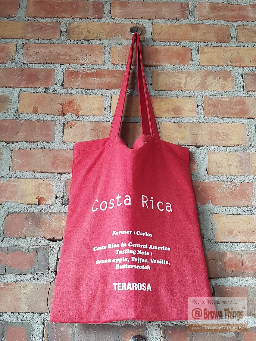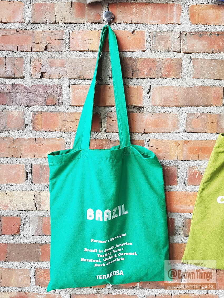 테라로사 서종점 문을 열고 들어서면 바로 왼쪽 빨강 벽돌벽에 매달려 있는 커피 산지 나라 이름을 적은 에코백들.