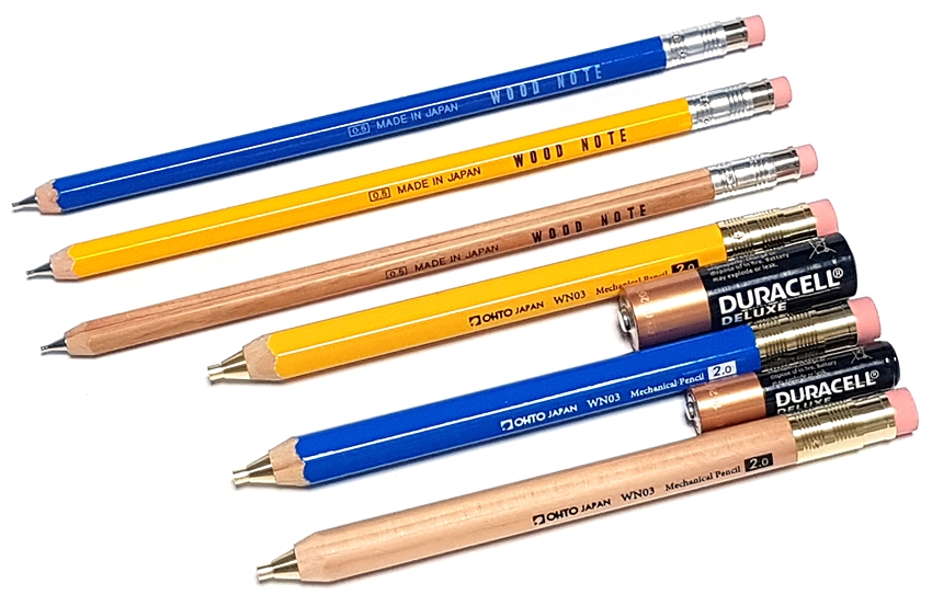 듀라셀 건전지 vs. 오토(OHTO) 몽당연필형 나무 샤프 vs. 키타보시(KITABOSHI) WOOD NOTE 연필형 나무 샤프 크기 비교.