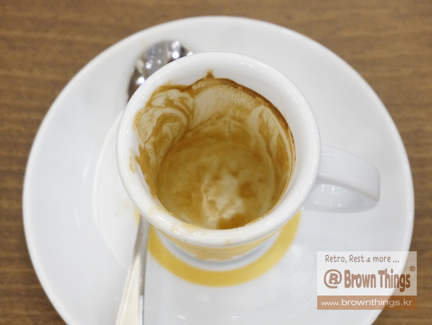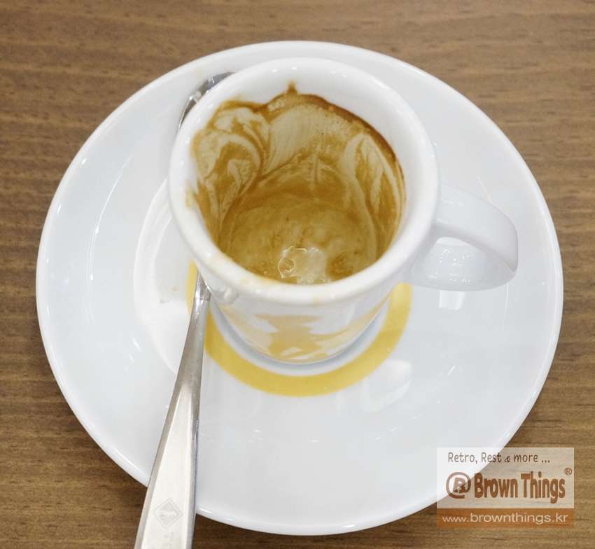 지인이 그라니따 콘파냐 한 숟갈 뜨기도 전에 설탕 뿌려서 한 사발 뚝딱! 한입에 털어 넣은 에스프레소 도피오.
