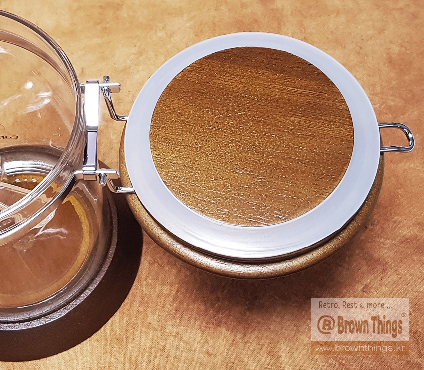 - 투명한 아크릴 원통에 실리콘 개스킷(gasket)을 두른 나무 뚜껑을 결합하는 금속 잠금 장치로 공기 수분 차단