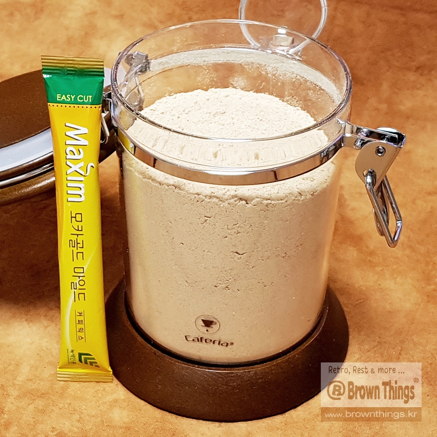 맥심 모카골드 커피믹스로 원두 보관용 밀폐 용기 크기 가늠.