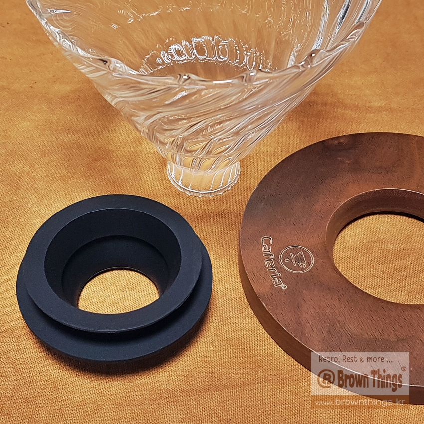 유리 드리퍼를 안정적으로 고정하는 실리콘 링을 결속한 호두나무 받침.