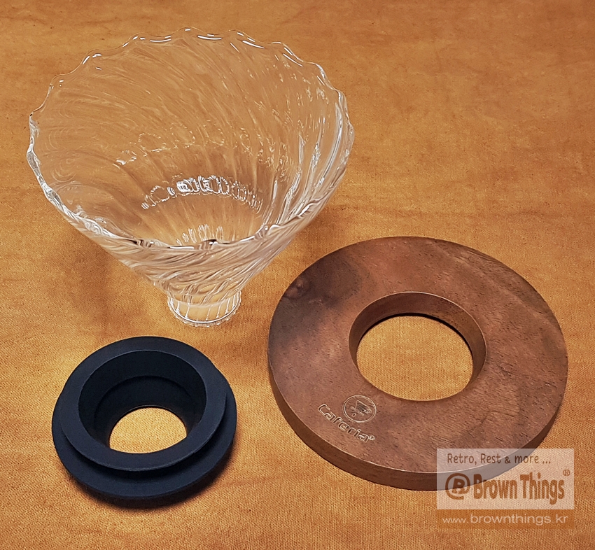유리 드리퍼 + 실리콘 고정링 + 나무 받침 3개 구조로 분리.