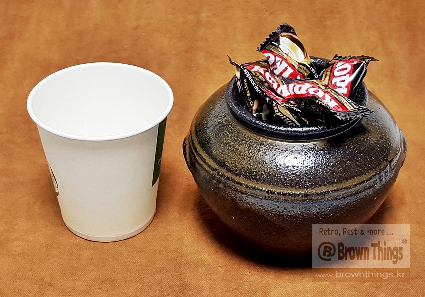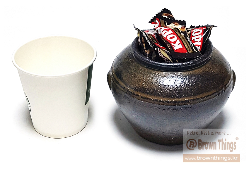소품 오지독 L과 종이컵 크기 비교.