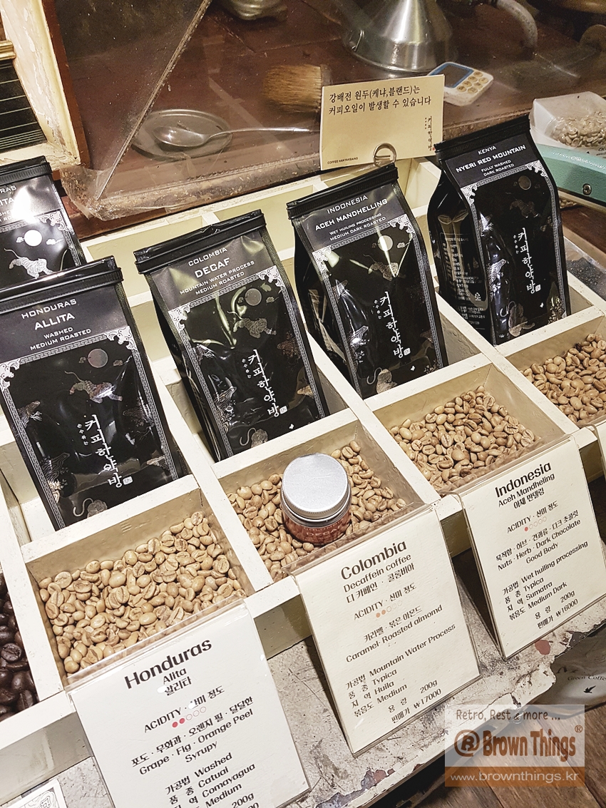 원두, 드립백 커피의 포장 디자인과 전시도 옛스러운 레트로 분위기 물씬.