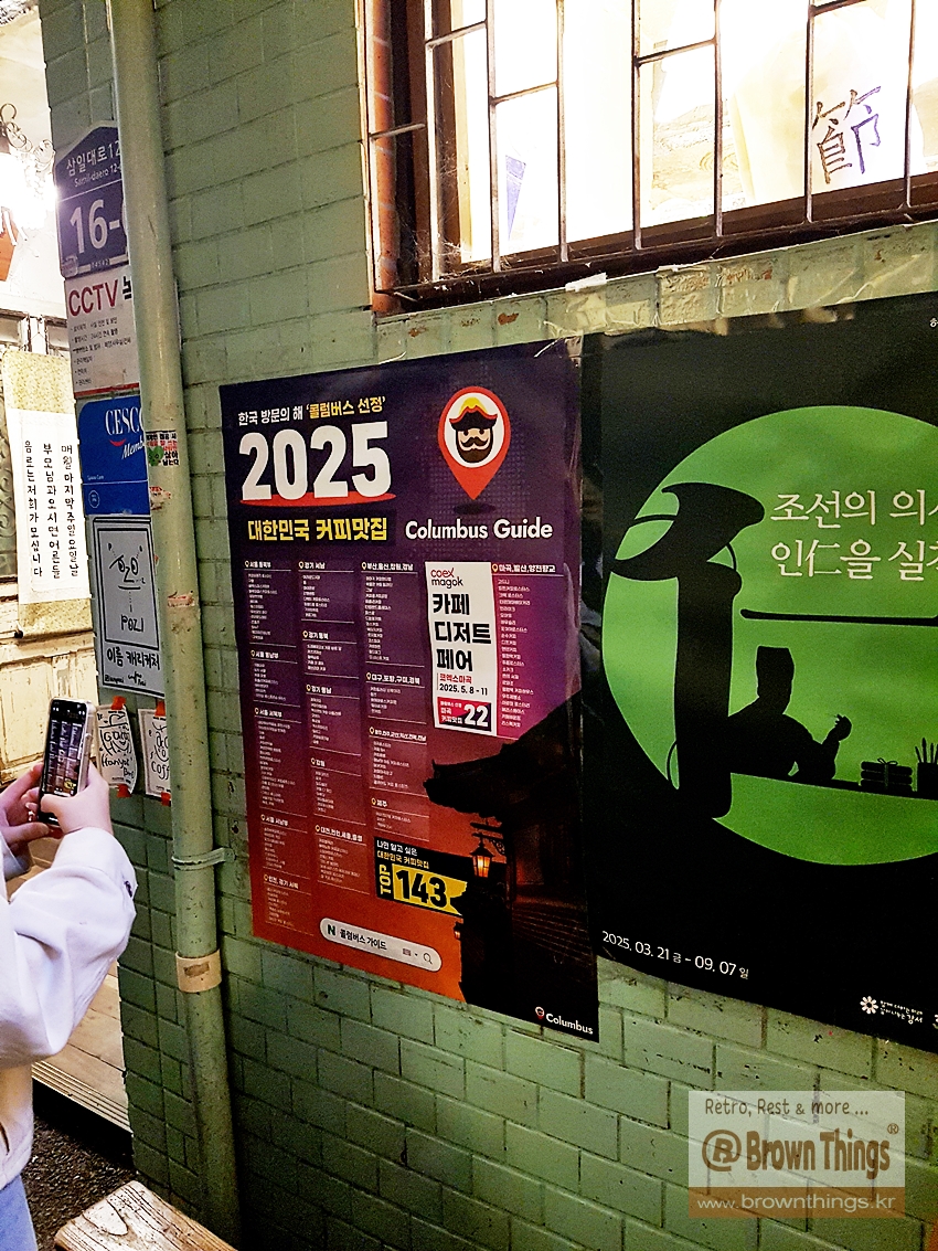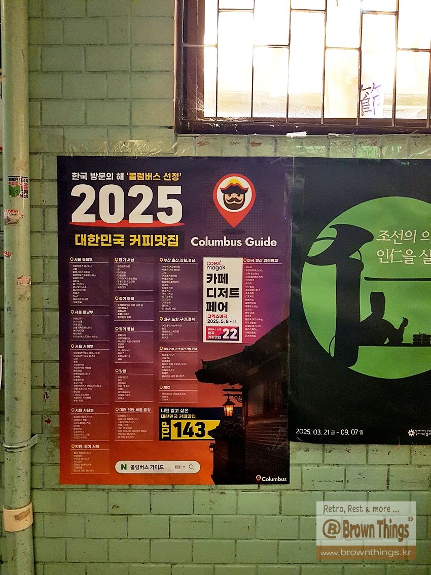 을지로 레트로 카페 커피한약방 담벼락 붙어 있는 콜럼버스 가이드 선정 대한민국 커피맛집 143개 카페 리스트 벽보.