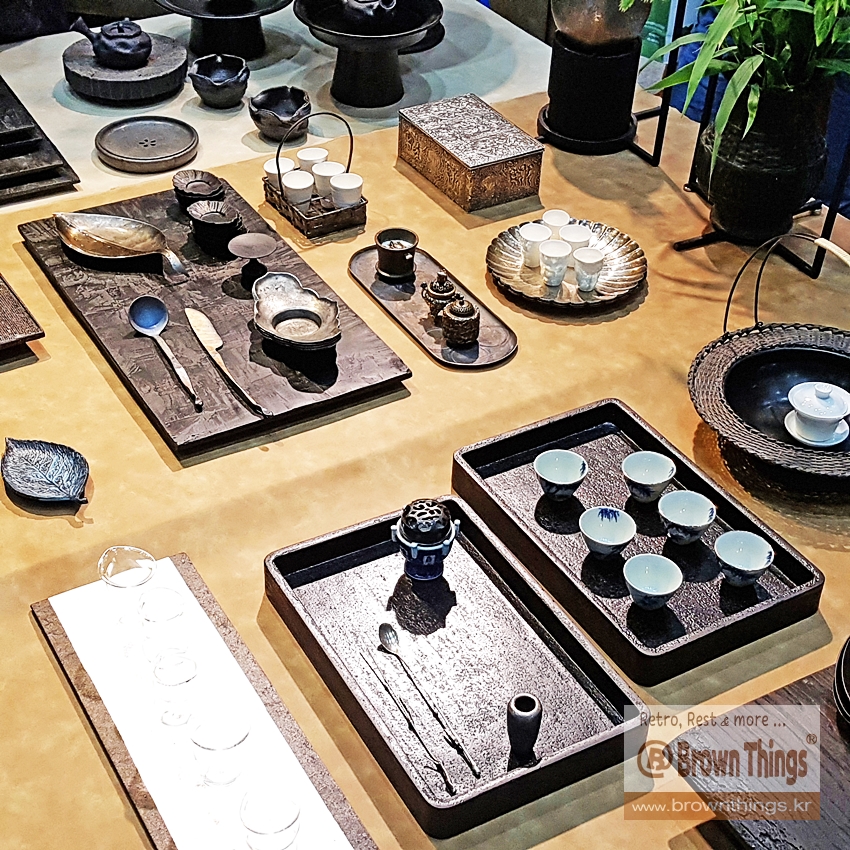 차도구 기물과 배경물에 고동색 다크 브라운 색조로 표현한,