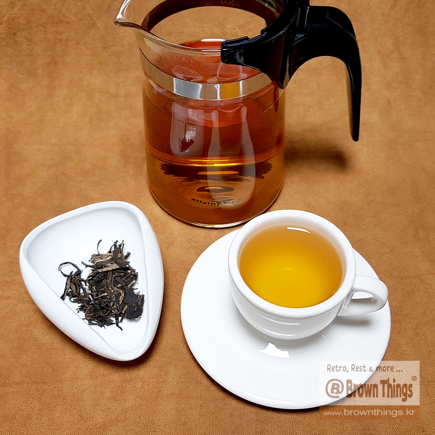 2015년 보이차 생차를 우려 담은 국내 생산 생활도자기 브랜드 노빌타(Nobilta)의 60ml 데미타스 (에스프레소 잔):