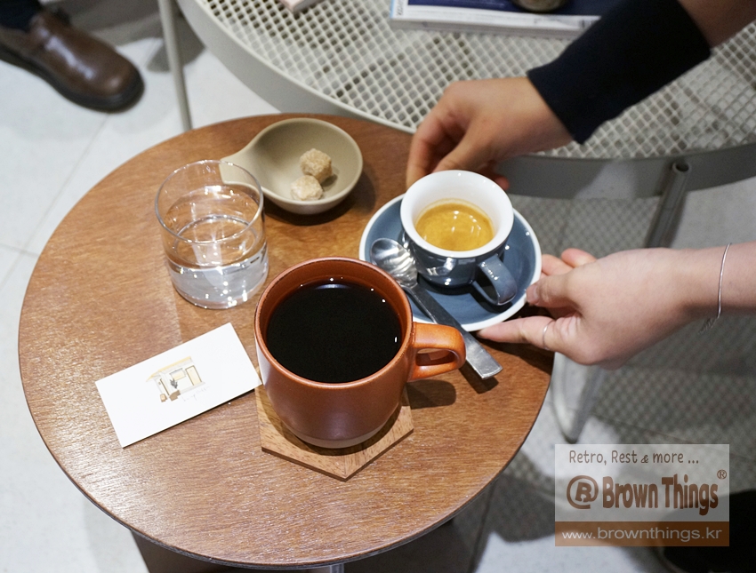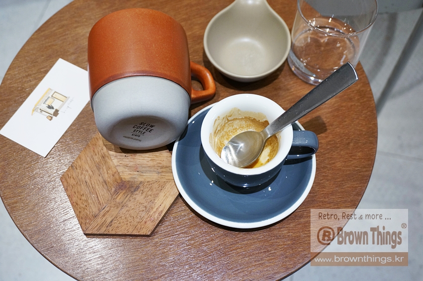 비읍커피에서 드립커피(킨토 슬로우 커피 스타일 오렌지 머그컵)와 에스프레소(애크미 ACME 데미타세 컵) 주문.