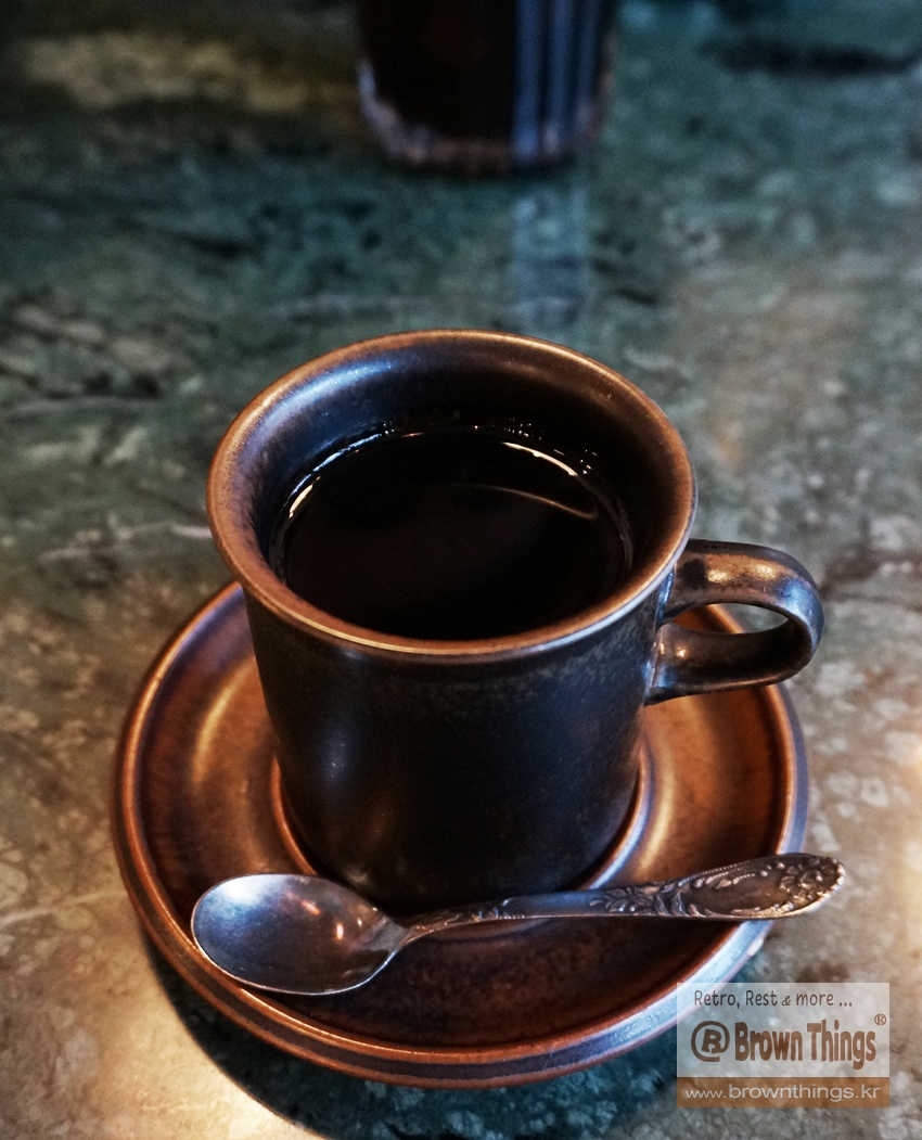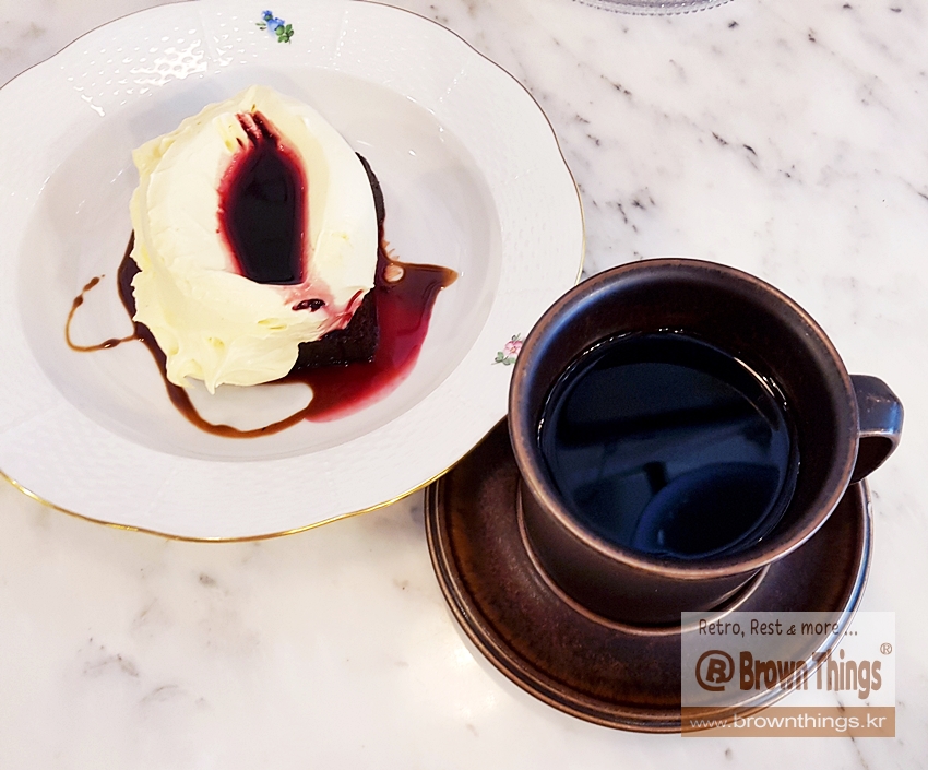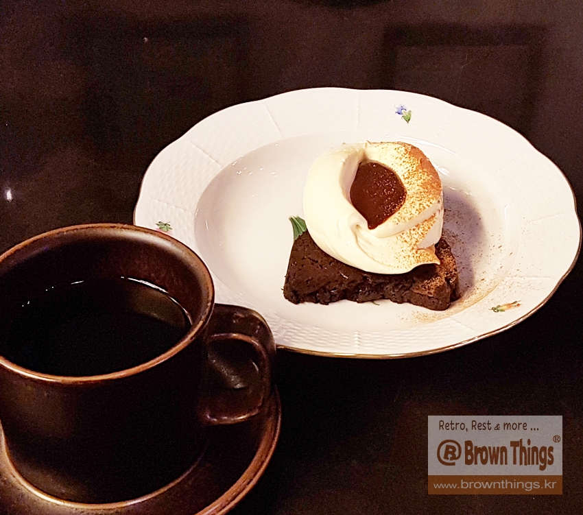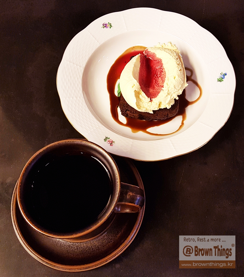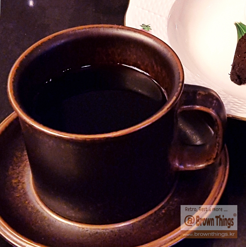 단언컨대 국내에서 가장 환상의 맛, 환장의 풍미를 머금고 있는 브라우니와 루스카 커피잔에 담은 케냐AA 융드립 커피