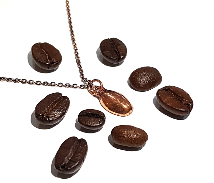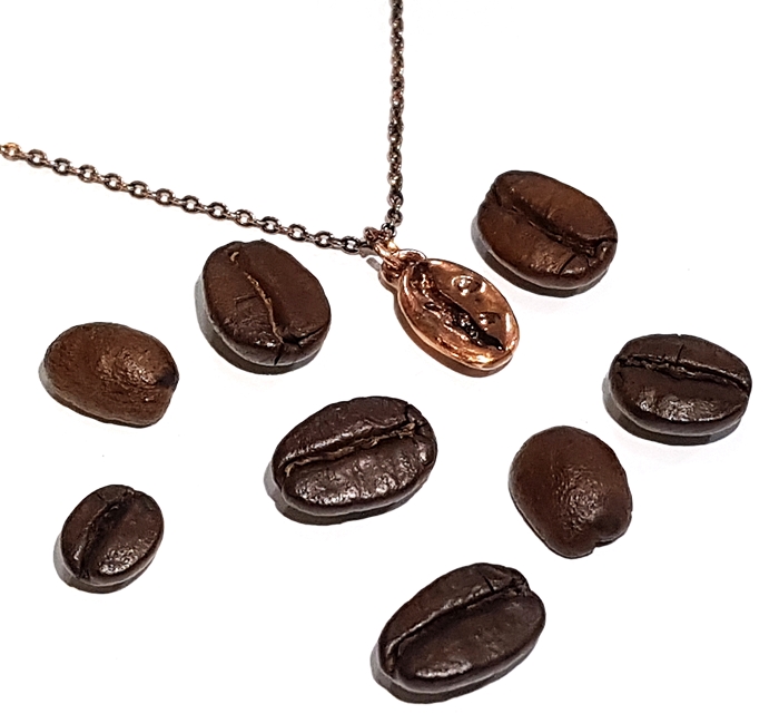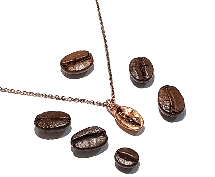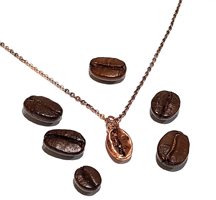 볶은 커피 원두를 본떠서 실물 크기로 만든 원두 펜던트 목걸이.