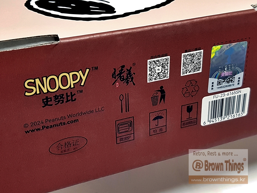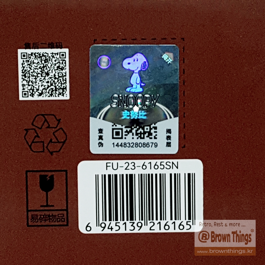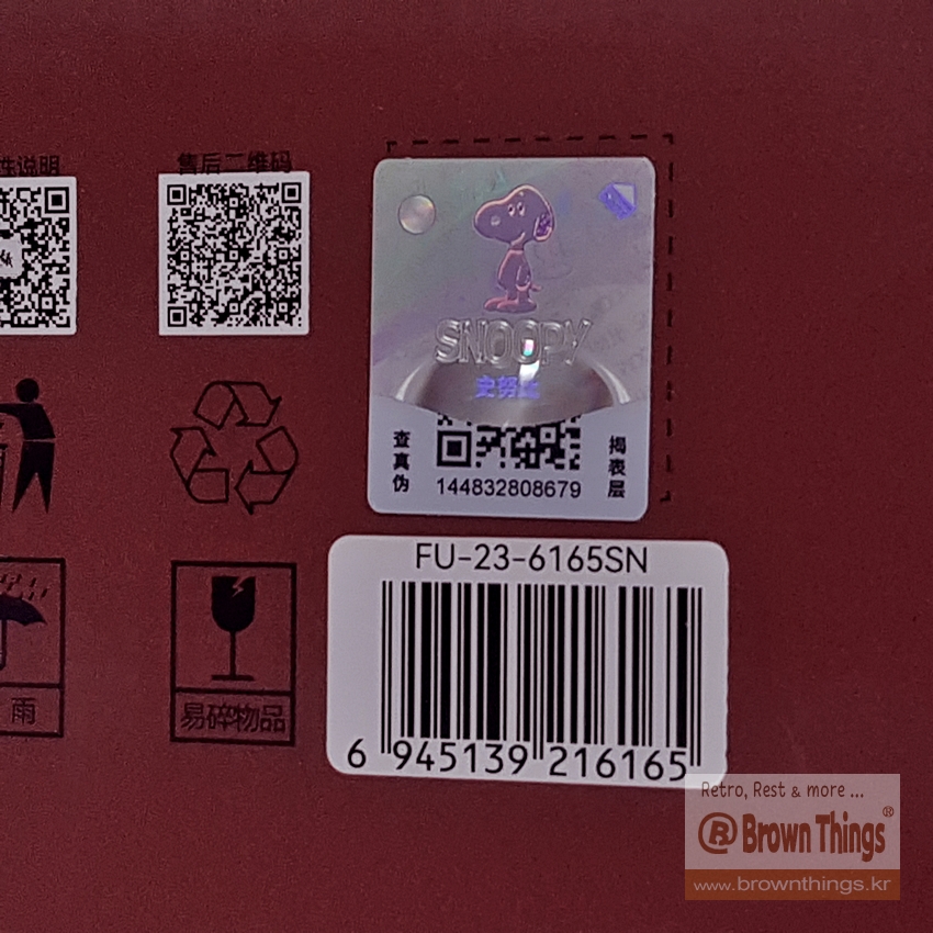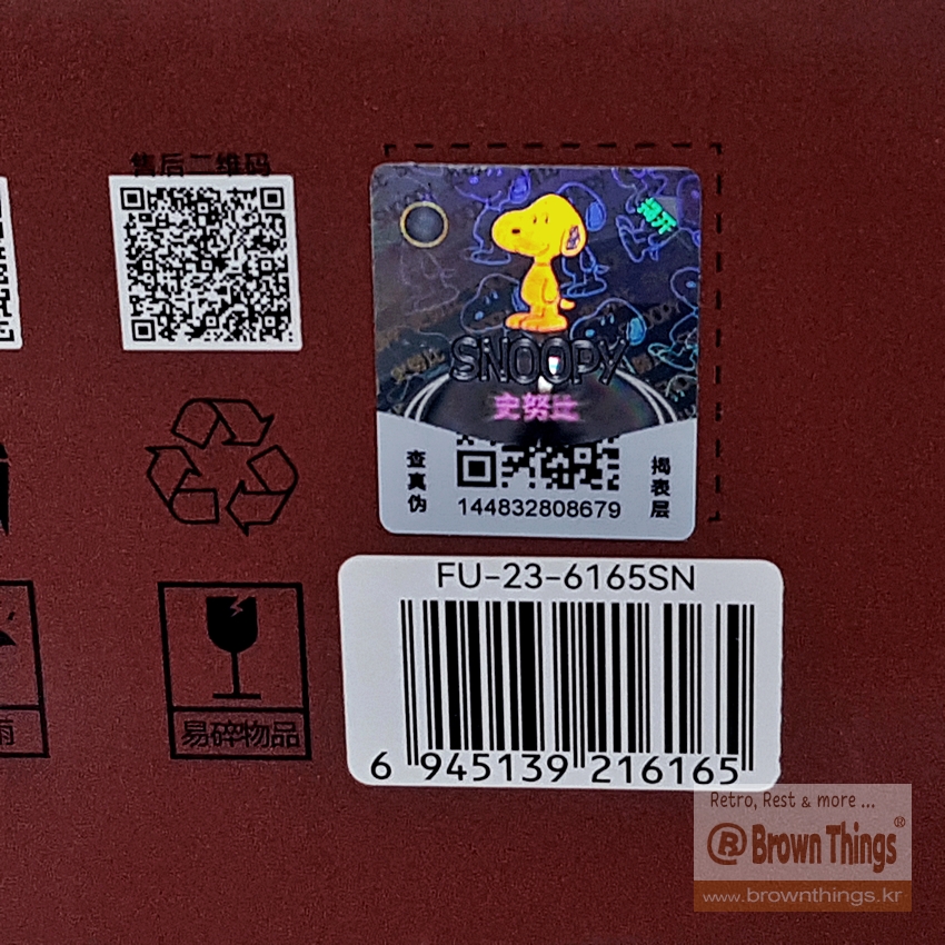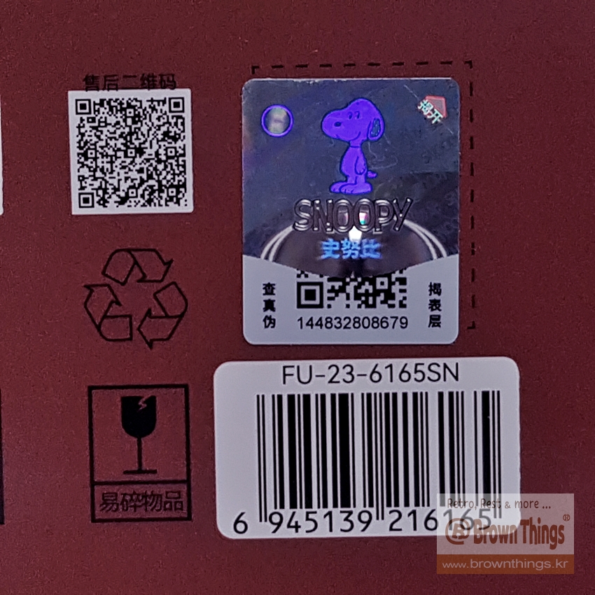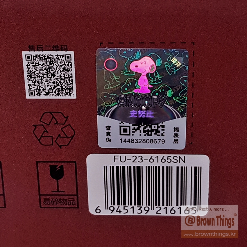 피너츠(PEANUTS)와 라이센스 계약을 맺고 만든 제품을 인증하는 홀로그램 스티커를 상자 측면에 부착.
