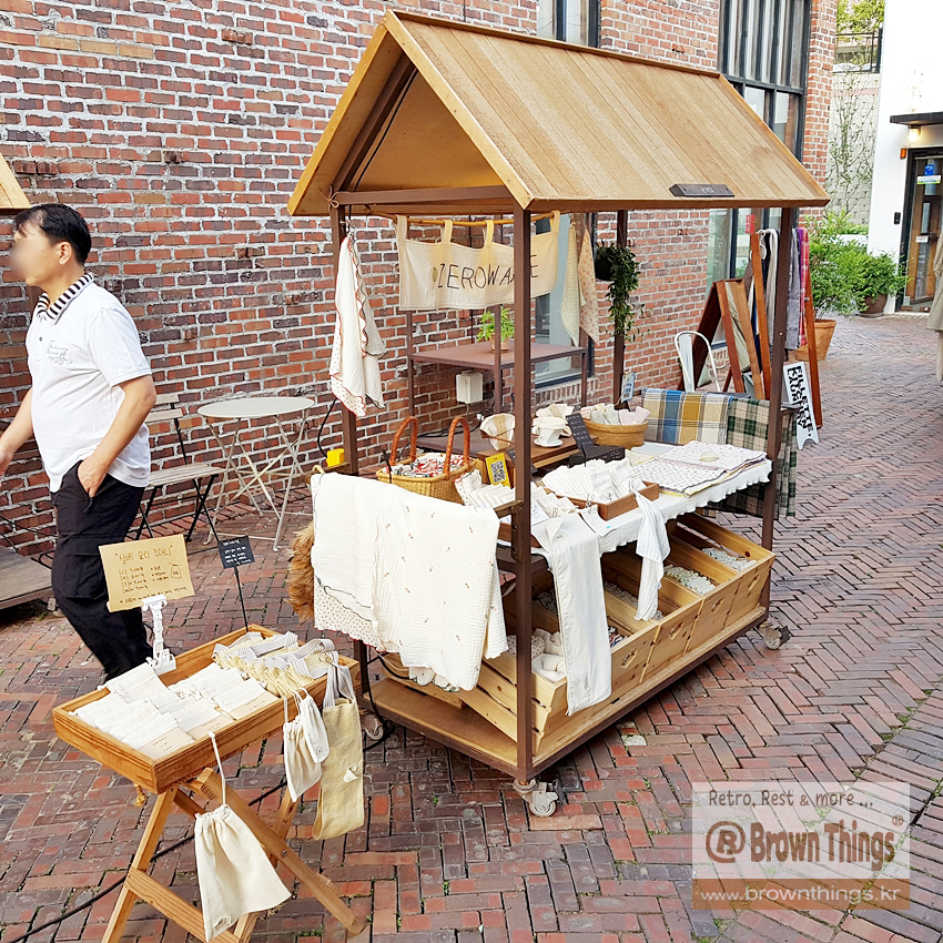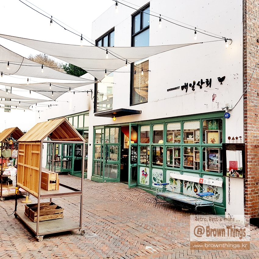 평소에는 건물 내부에 있다가 날 좋은 날에는 통로에 매대를 내놓고 전시하는 매일상회 입점 브랜드.