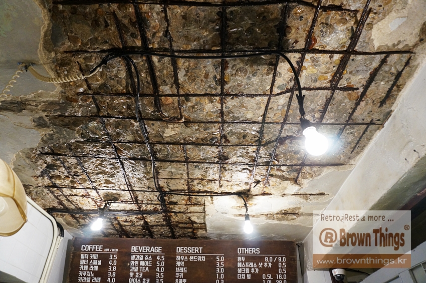 건축 당시의 자체 구조물은 아닌 것으로 보이는 철근을 별도로 붙여서 노출 콘크리트의 인더스트리얼 인테리어 효과.