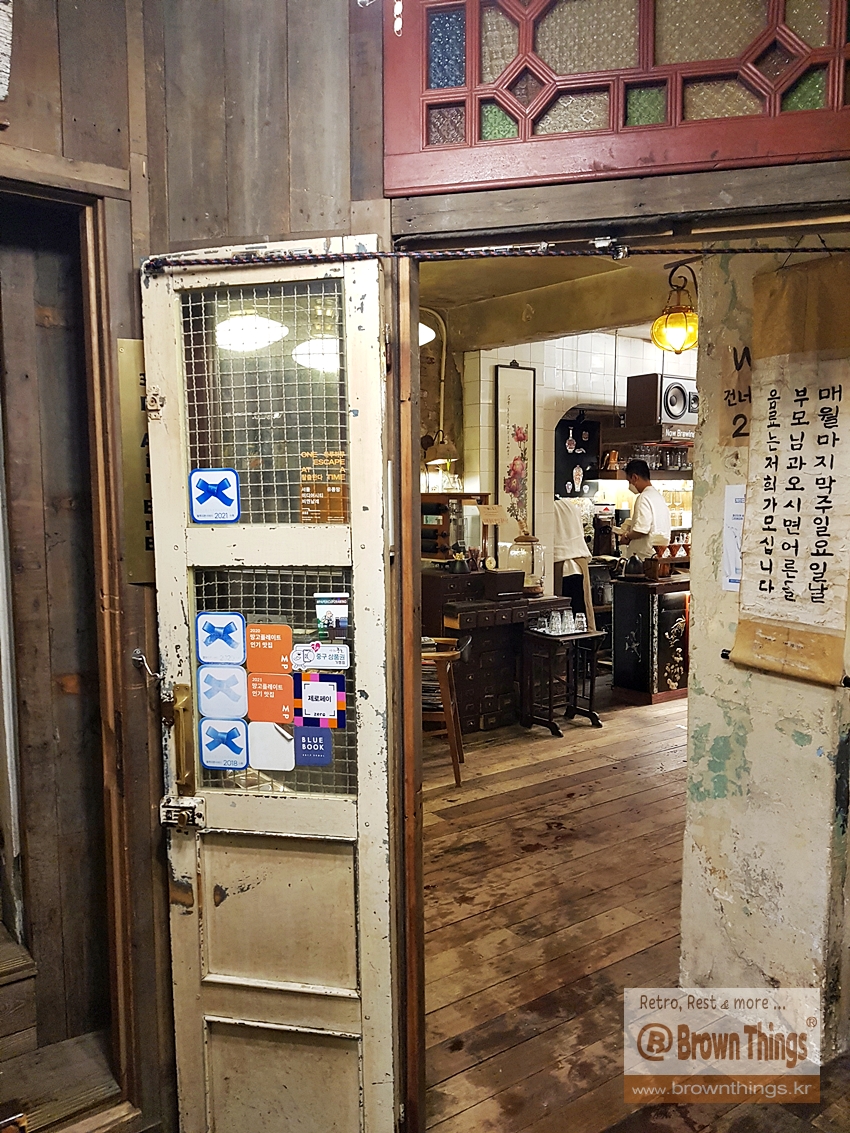 옛날식 나무 문을 구해서 달아 놓은 커피한약방 입구.