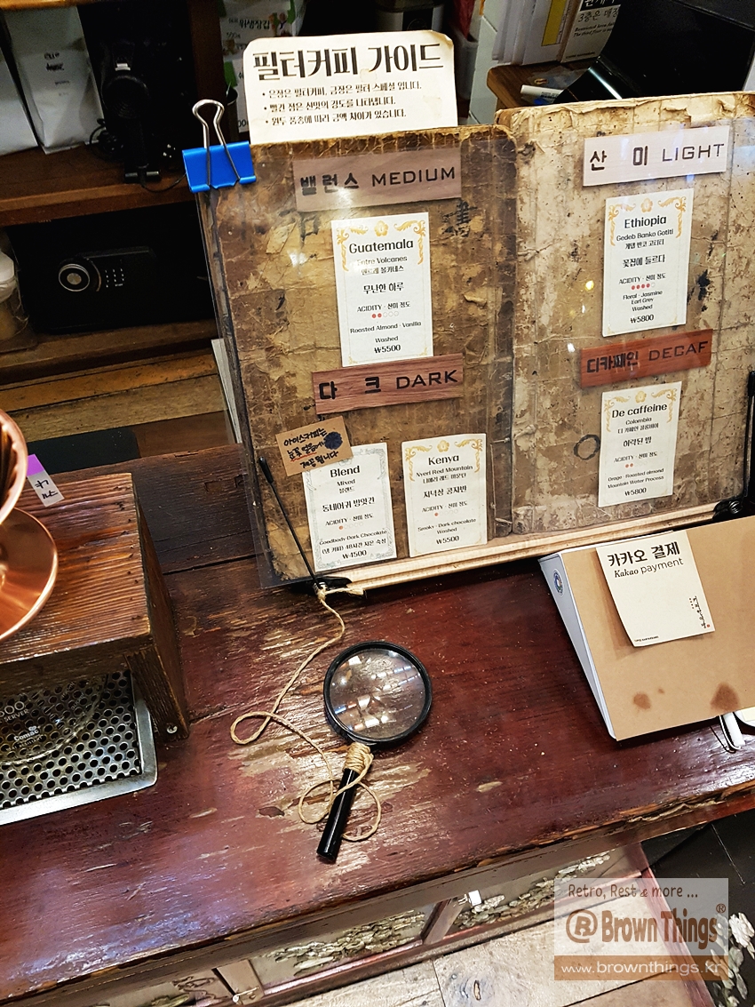 오래된 나무 합판에 붙인 커피한약방 메뉴판.