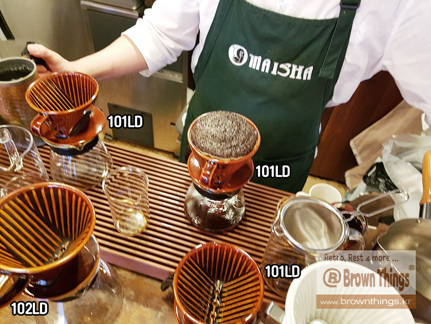 마이샤님이 갈색 칼리타 도자기 드리퍼 101D로 핸드드립 커피 내리는 모습 구경하기 ↓