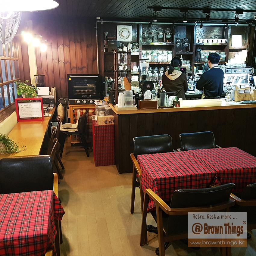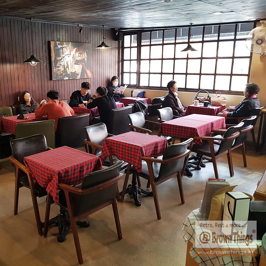 촌스러운 빨강 바탕 체크 탁자보가 따스하고 정겨운 커피집 미네르바.