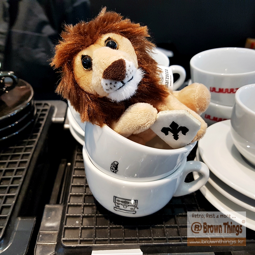 에스프레소 머신 리네아 미니에 누워 있는 라마로조코의 상징 사자 인형