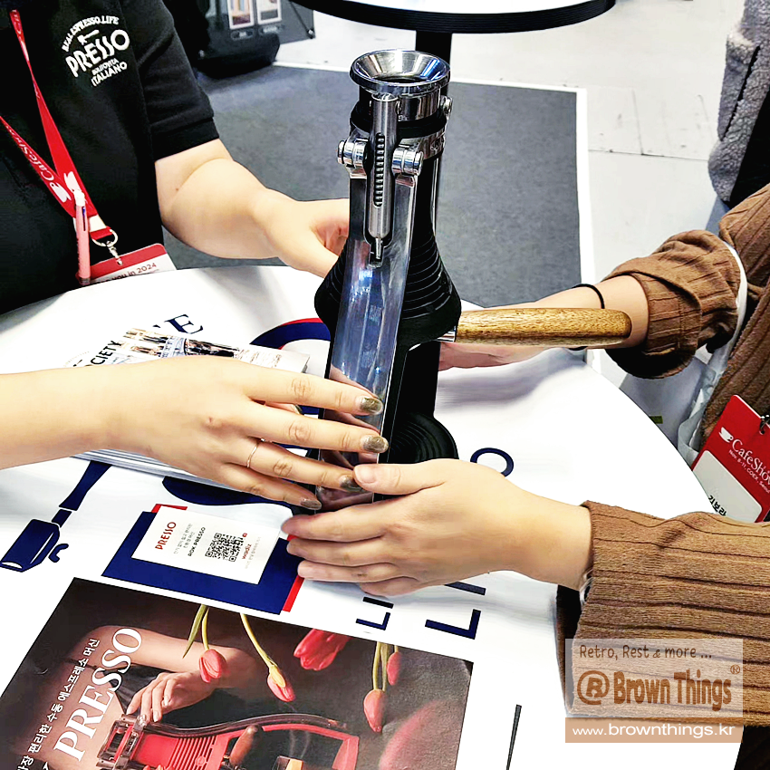 수동 에스프레소 머신 ROK 작동법을 관람객에게 설명하는 프레소 Presso 직원.