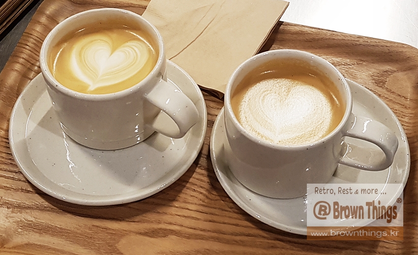 플랫화이트 두 잔을 완성해서 이제 쟁반에 서빙을 준비하시는 결 바리스타.