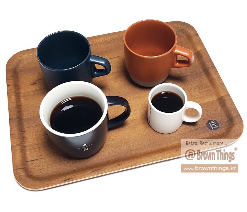 두 잔 이상 주문에는 킨토 논슬립 나무 쟁반 대형 L(360x280mm)에, 한 잔 주문에는 소형 S(270x200mm)에 서빙.