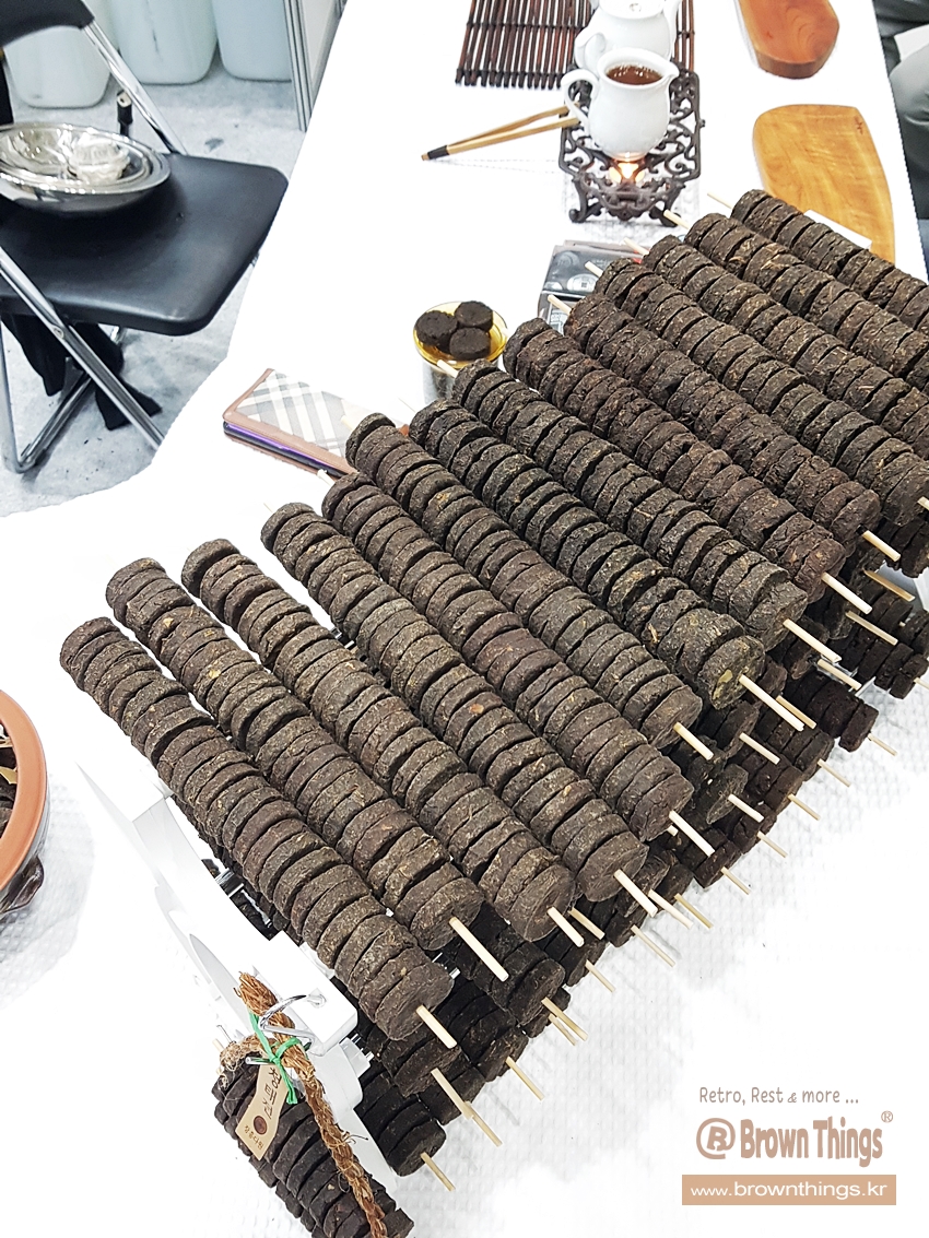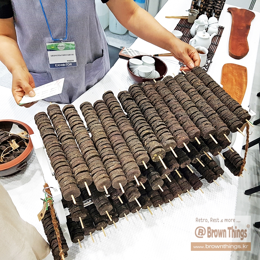 만든 떡차 가운데 구멍을 뚫어 나무 꼬챙이에 꿰어서 발효하고 보관하는 청태전.