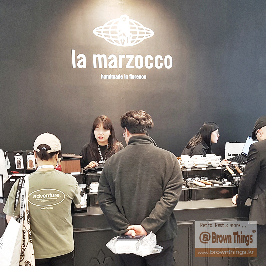 라마르조코 액세서리 굿즈 부스 앞으로 넓게 펼쳐진 에스프레소 머신, 그라인더 부스