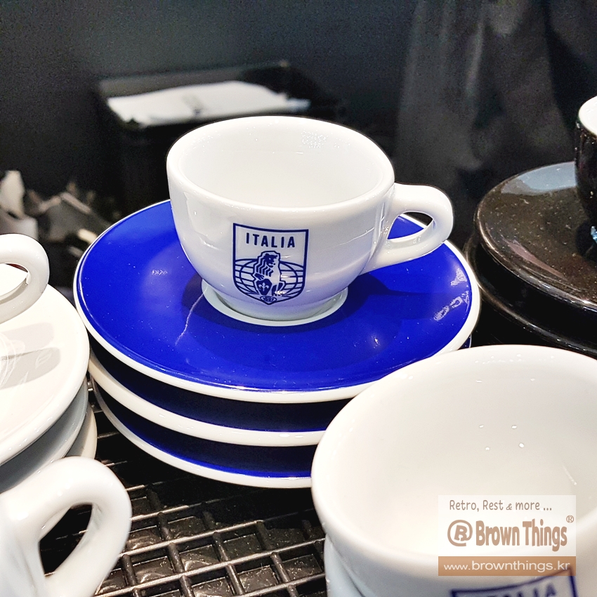 진파랑 색감의 잔받침으로 주목도가 높은 이탈리아 에스프레소 데미타스 잔.