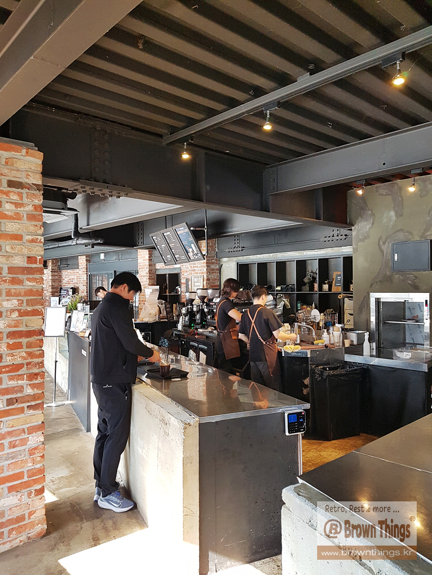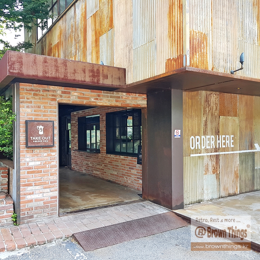 건물 외벽에 입힌 함석이 시간을 두고 녹슬어서 자연스러운 세월감과 다양한 농담의 갈색이 나타나는 녹슨 커피집.