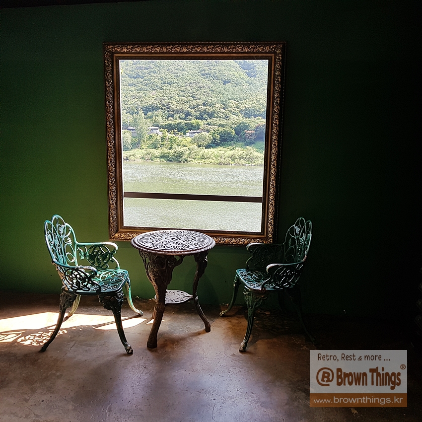 흐르는 북한강과 녹빛 산등성이가 담겨 있는 액자는 나인블럭 뷰 팔당의 시그니처 포토존.