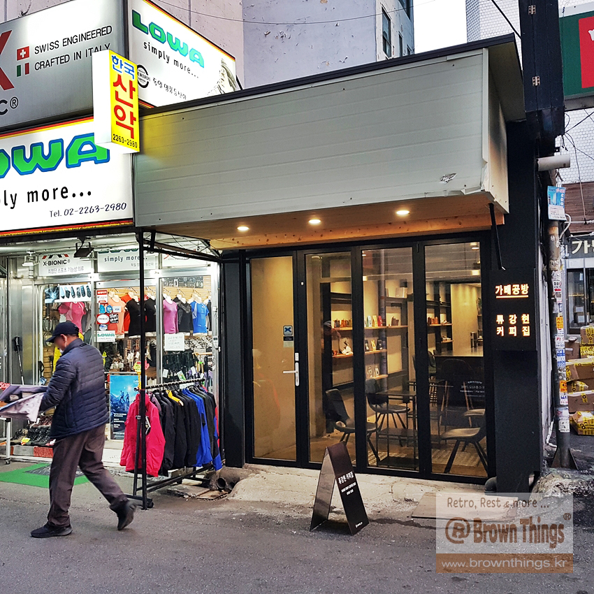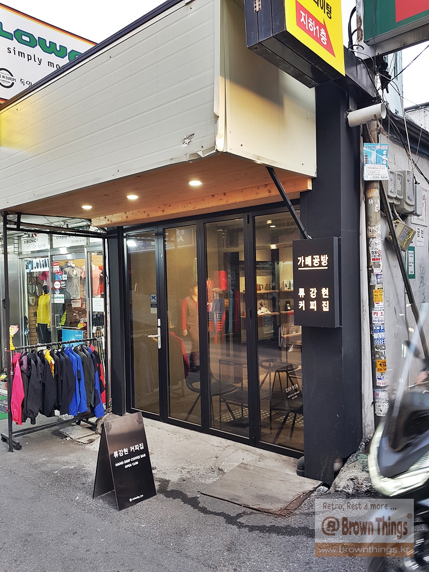 광장시장 동문 건너편 등산용품 아웃도어용품점 밀집 거리 중간 지점에 위치한 류강현 커피집.