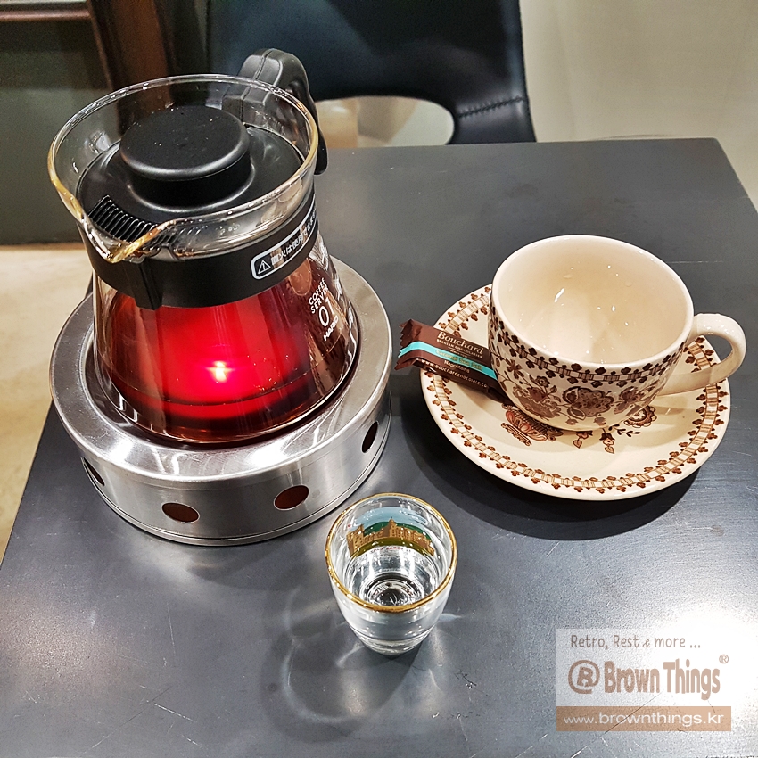 티라이트 워머에 올린 커피 서버에 담은 케냐 아리차 내추럴 핸드드립 커피, 부샤드 소금 초콜릿, 탄산수.