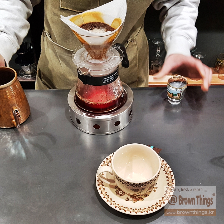 본 주문 핸드드립 한 잔과 동일한 양 원두로 소량 물을 부어 에스프레소 농도로 천천히 추출한 에스프레소 드립 커피를 제공.