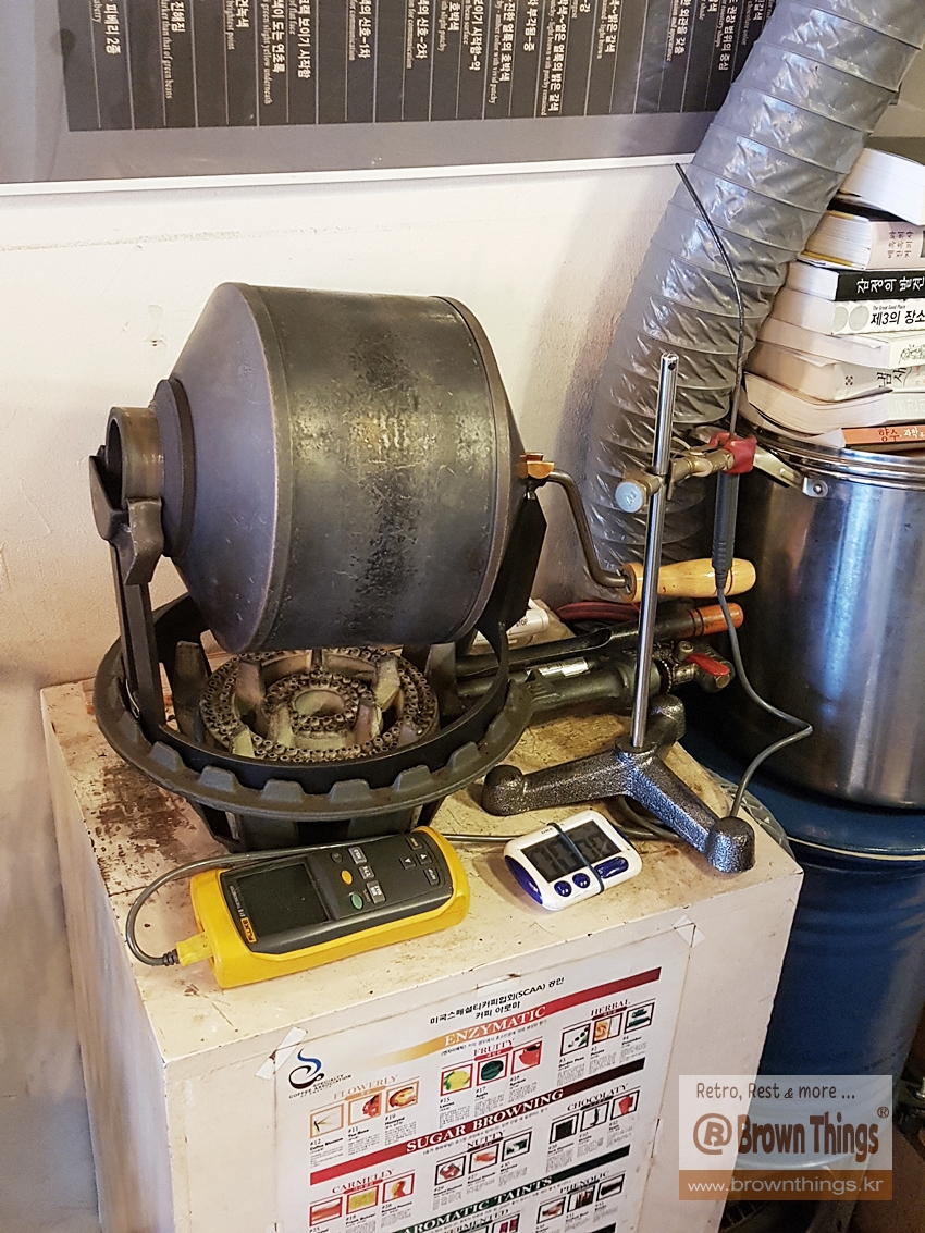 커피 테이블 왼쪽에는 매일 사용하는 통돌이 로스터.