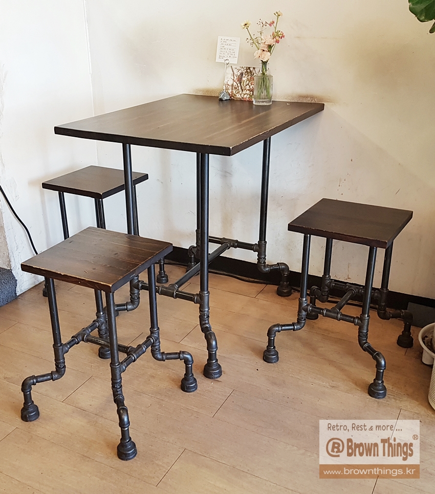 쇠파이프로 다리와 기둥을 만든 의자 탁자 → 일명 인더스트리얼 디자인 가구.