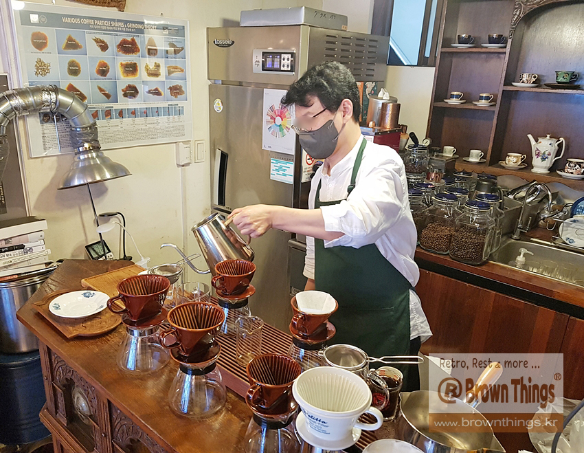 망원동 커피하우스 마이샤에서 핸드드립 커피 내리는
