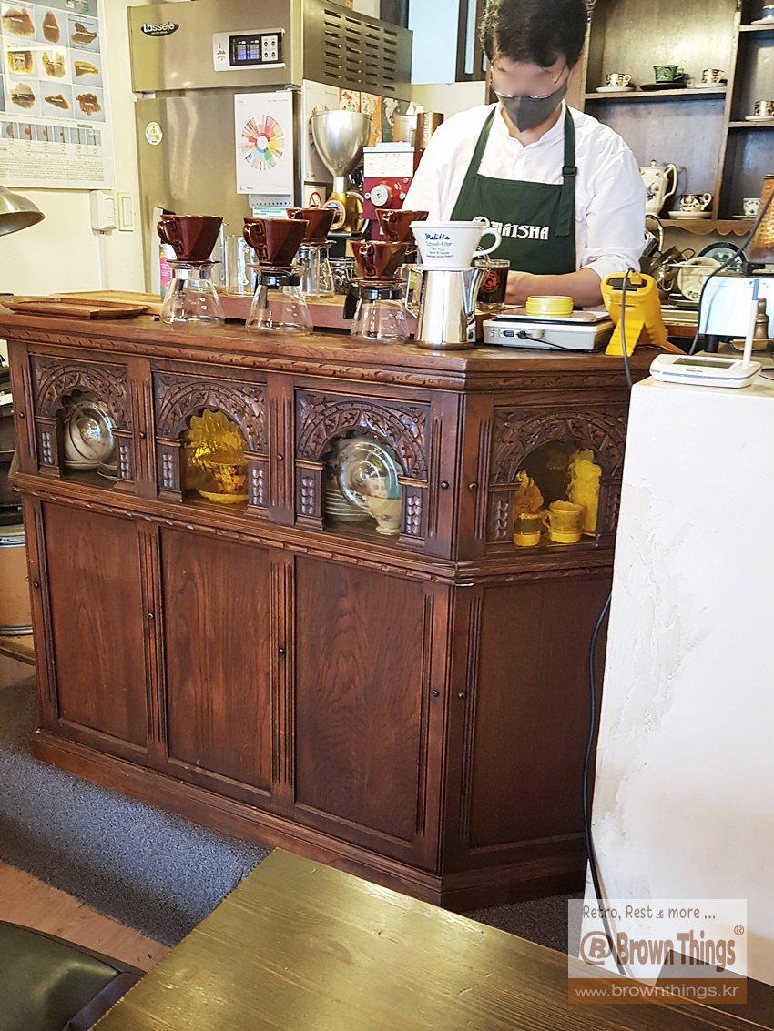 세월을 머금은 앤틱 탁자, 의자, 가구로 꾸민 커피하우스 마이샤.