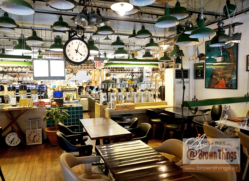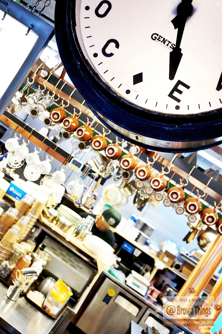 주로 영국이 출처인 빈티지 벽시계들과 조명 갓 소켓을 수집해서 카페 공간에 전시하는 더블하모니.