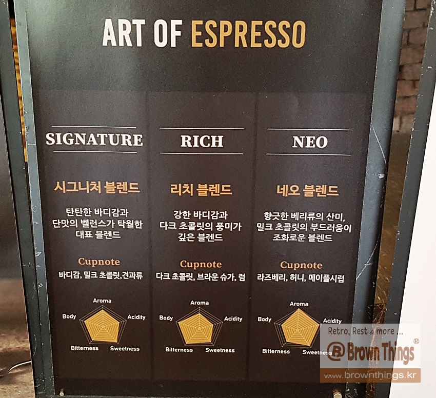 에스프레소 커피 블렌딩 원두 3종: 시그니처 블렌드, 리치 블렌드, 네오 블렌드.