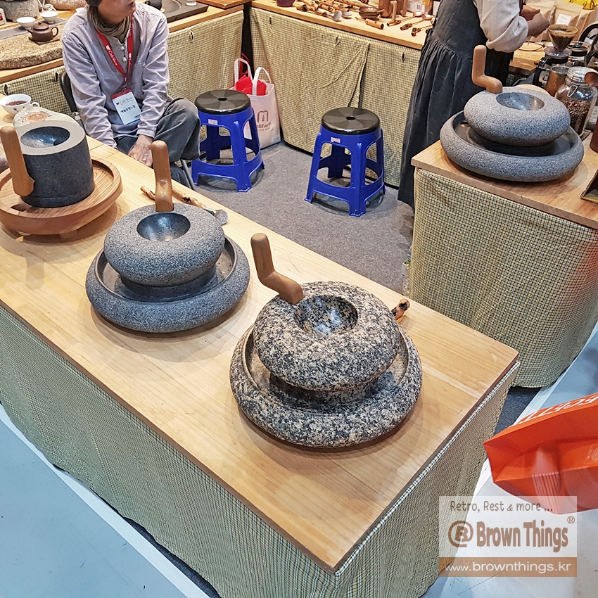 돌 재질에 따라서 각양 각색 다른 느낌을 주는 맷돌 커피 그라인더.