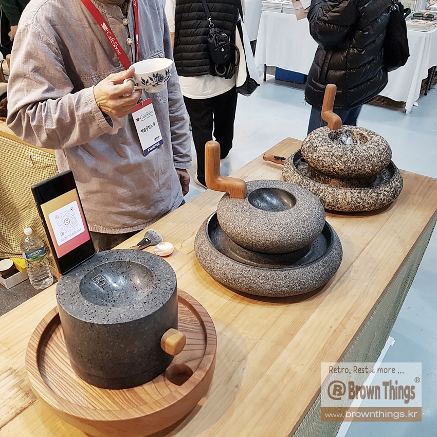 위 표면이 매끈하고 작은 검정이 2023 서울카페쇼에 선보인 작품들 중에서는 가장 저렴한 맷돌 커피 그라인더.