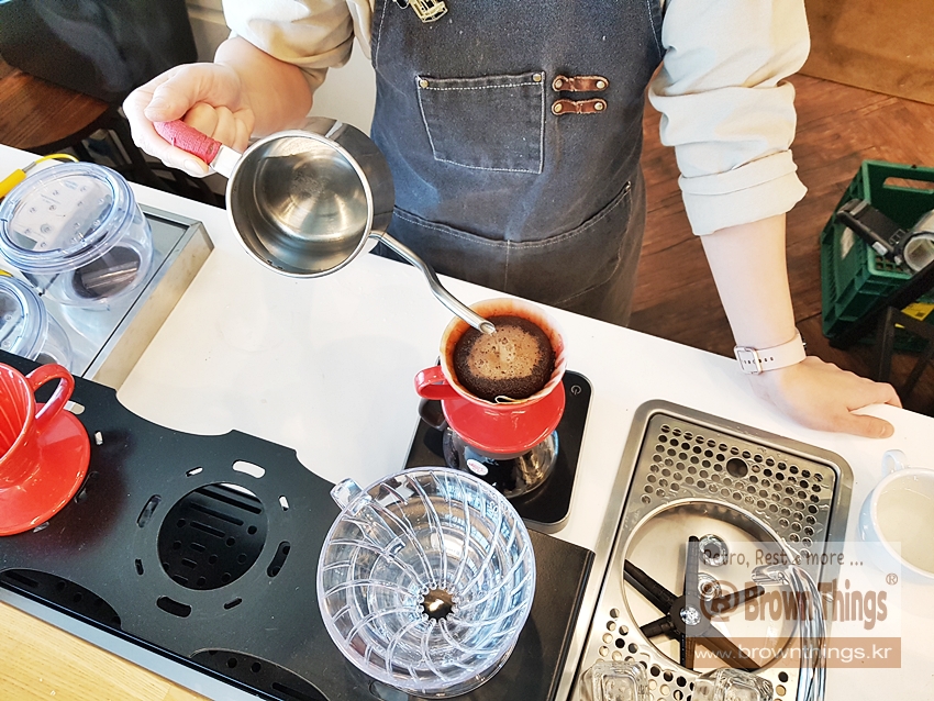 주문한 인도 바드라 원두 핸드드립 커피 하리오 추출하시는 바리스타.
