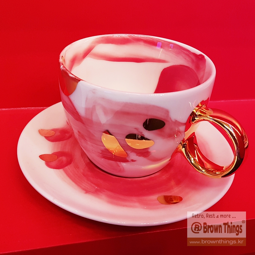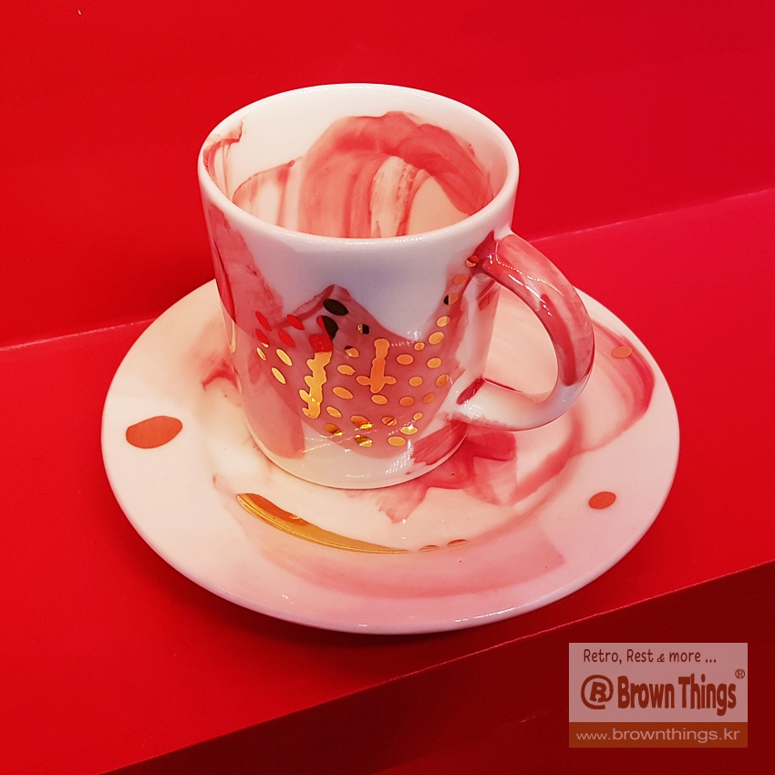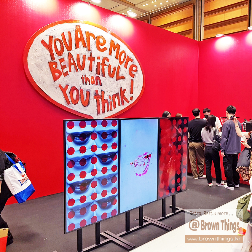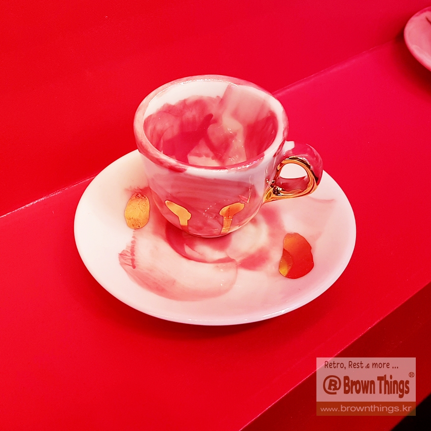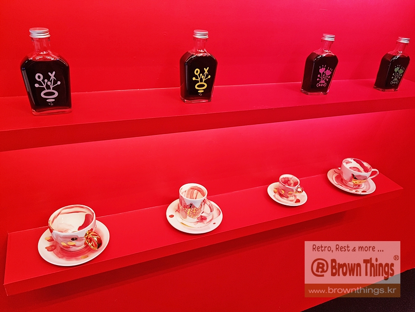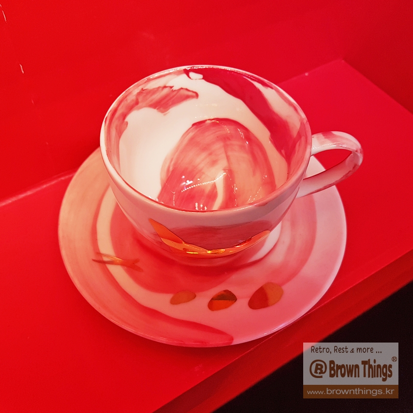 새빨강 벽면과 쿠사마 야요이의 빨강 도트 미술을 연상케 하는 비디오 아트, 그리고 빨간맛 커피잔까지.