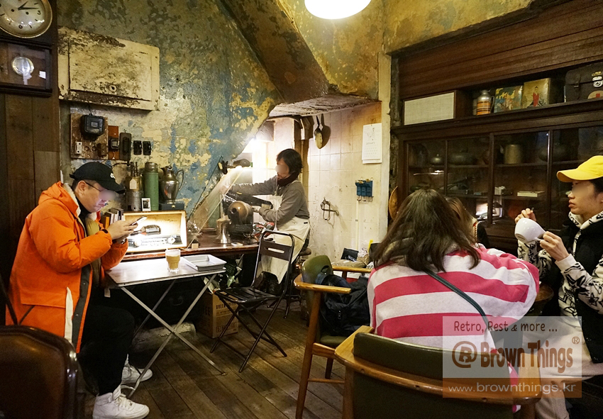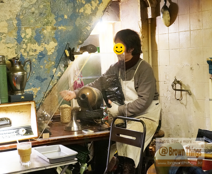커피한약방 사람들이 연두빛 생두를 볶아 갈빛 원두로 만드는 모습은 커피한약방 공간디자인의 일부이며, 하나의 인테리어 소품.