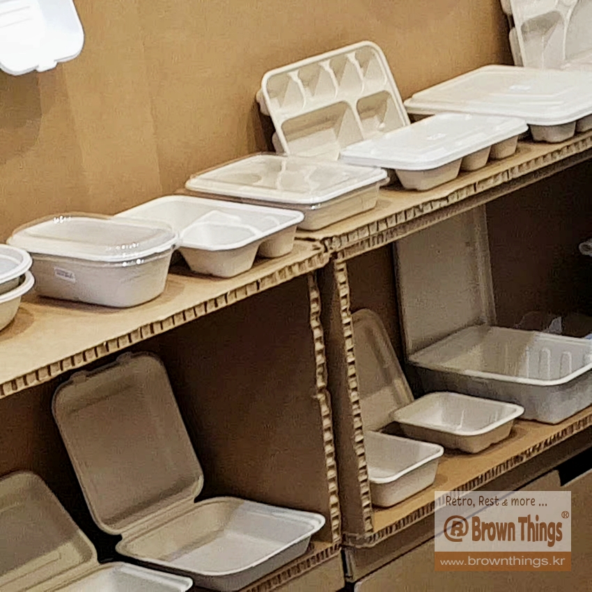 밀짚 펄프로 만든 도시락 용기 + PLA(옥수수 성분 폴리젖산 플라스틱)로 만든 투명 용기 덮게.