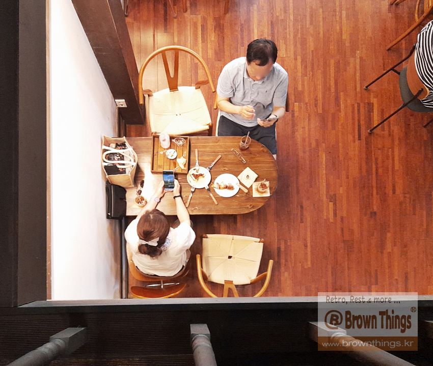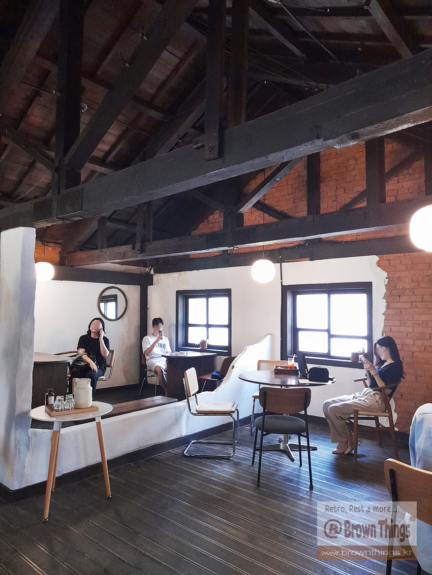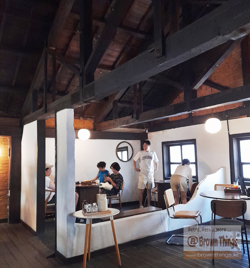 천장이 높은 단층 목조 지지 건물을 복층으로 이루어진 군산 카페 틈.